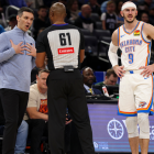The ref kindly explains the rules to Mark Daigneault and Alex Caruso